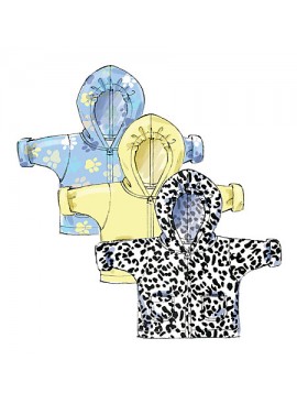 BABY JACKET, OVERALLS, PANTS, BABY NEST & HAT: Unlined jacket with partially elastic hood, inside out. Overalls with buttoned suspenders and snap crotch. A, B: Pockets, stitched hem. Pants with elastic waist. Sleeve hem A, C: Narrow, sleeves longer than standard length, turned up, inside out. Baby nest with tab and snap. Purchased appliqué. D: Narrow hem or bias tape purchased for neckline. E: Collar, sleeves and cuffs. A, D, E: Front zipper. Hat lined with self-fabric. Created for lightweight, medium stretch knits.