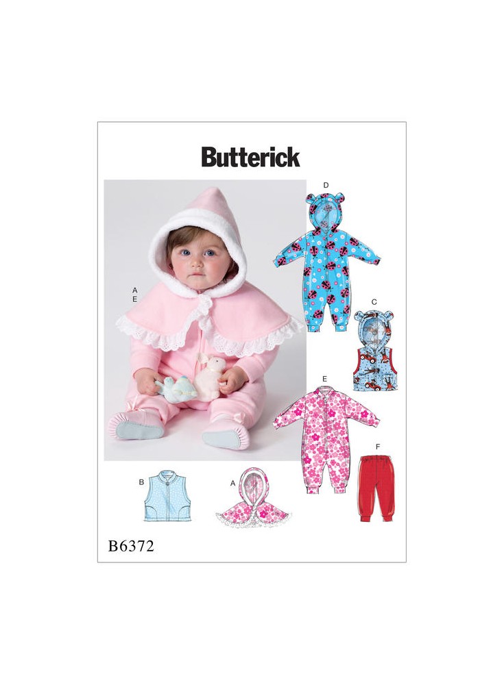 CAPE, VEST, BABY NURSING BAG AND PANTS (BABY): Hooded cape, contrasting band, snap closure and gathered lace trim. Vest with front zipper and purchased bias trim on armholes. Baby nuggling bag with front zipper. C, D: Hood with ears. Pants with elastic waist.