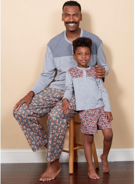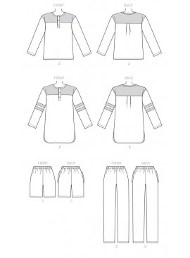 TOP, TUNIC, SHORTS AND TROUSERS (J. WOMEN/MEN/KIDS/BOYS/GIRL): Loose-fitting, pull-over top and tunic with front fastening with snap buttons, contrasting front and back yoke, and back pleats in the yoke. B: Contrasting sleeve bands, shaped hemline. Loose-fitting trousers and shorts with straight leg and elastic waistband.