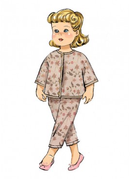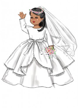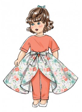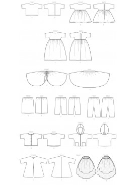 VÊTEMENT POUR POUPÉE DE 46cm: Haut A. Robe B. Robe C. Dessus de jupe D à doublure et dentelle ou galon facultatifs achetés. Jupe E et Pantalon F, G à taille élastique. Veste H à bordure de ruban de biais acheté. Veste I à capuchon. Manteau J. Voile K à galon et fleurs achetés.