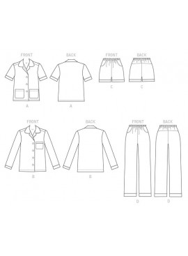 | HAUT, SHORT ET PANTALON (J. FEMME): Haut très ample, à col, coutures d’épaule en avant, poches, et ourlets piqués. B: Bandes de poche. Short et pantalon (taille basse) à jambe droite, ceinture élastique, poches côté devant et empiècement dos. Manches A, B et ourlets C, D: Bandes. Passepoil acheté. |