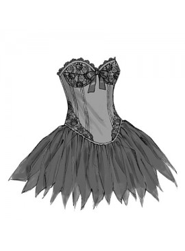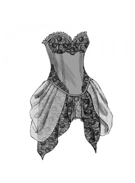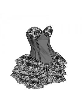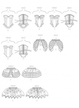 DÉGUISEMENTS (J. FEMME): Corset moulant, doublé, entoilé de triplure et entoilage, à soutien-gorge à armature, coutures apparentes, ligne d’ourlet en forme, bordure du même tissu en biais pour la finition, prolongement dos, cordon et surpiqûre. Ruban acheté pour le cordon, et nœud B. B, C: Appliqués. B, C, D: Pièces superposées. Jupe à ceinture, fronces et fermeture à crochet. E: Drapé plissé (ourlet très étroit), jupe doublée. F: Volants doublées, galon acheté. G: Quatre épaisseurs de volants. Doublure de jupe et G: Bord non fini pour la finition.