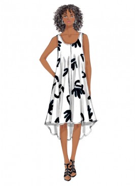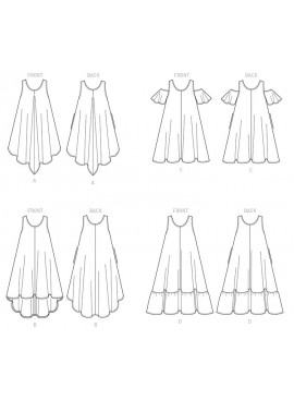 | ROBE (J. FEMME): Robe évasée, très ample, à passer par la tête à encolure profonde, poches couture latérale, parementures d’entournure et d’encolure en biais, et ourlet étroit. A, B: Ligne d’ourlet en forme. A: Coupé sur le fil de trame. B: L’envers visible. C: Manches à épaule dénudée. D: Volant à l’ourlet. |