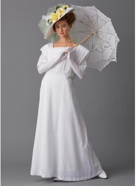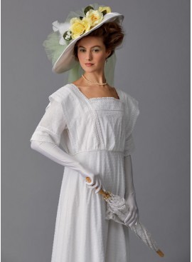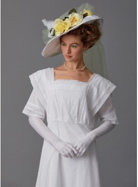 DÉGUISEMENT ET CHAPEAU (J. FEMME): Robe ample à fermetures à agrafe dos et galons achetés. Chapeau entoilé à fil de fer dans le fond, nœud coupé aux mesures données, et fleurs achetées. Chapeau en tailles Petite (55cm), Moyenne (57cm) et Grande (60cm).